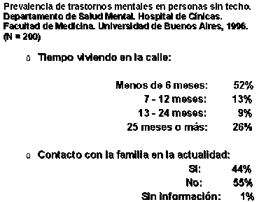 Una cuarta parte de los entrevistados vivía en la calle desde hacía más de dos años atrás. El cincuenta y dos por ciento dijo que hacía solamente tres meses que se encontraba en esa situación. A pesar de que la mayoría declaró que tenía hermanos o hijos o padre o madre vivos, no tenían ninguna clase de contactos familiares.Asimismo, es de gran interés el estudio de la utilización de servicios de salud por parte de las personas de bajos recursos :