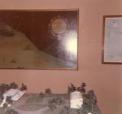 Otro de los ejemplos que se cita, es un mapa cartográfico pintado de la Ensenada de Barragán (Fig. 6), donde la iluminación central intensa produce reflejo en el mapa, pudiéndose evitar con una luz tenue y colocando un spot dirigido en forma indirecta para que no provoque estos fastidiosos reflejos. Aquí el factor HR es importantísimo al estar contra la pared. Este y otro mapa cercano están sufriendo la decoloración y efecto comba, a raíz de los factores ambientales (humedad-iluminación-temperatura) actuantes. Faltándoles la aireación y mantener una temperatura adecuada (~18°C) En este caso la iluminación natural es la predominante, cuando debería ser lo contrario, como ya fue indicado.