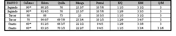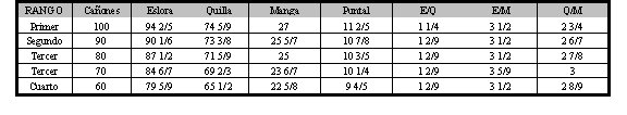 72.- Duhamel hace referencia a las Ordenanzas de 1689, indicando que en su Título 2, libro 13, recopilan la división de los buques en cinco rangos, el 2º y 3º, divididos en de 1er y 2º orden. Indica también que estas Ordenanzas fijan la E, M y P. Ver, op. cit. pg 60.