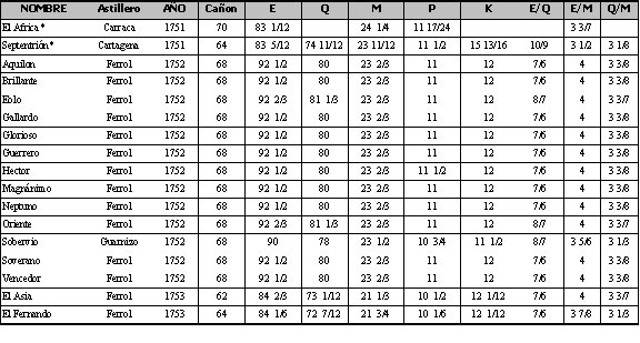 Los buques elegidos era los de Gaztañeta, regulados por su quilla en 60 y 64 codos, con un porte de sesenta y dos y sesenta y ocho cañones, en su versión de viaje largo. El único error en la elección era el calibre de la artillería, notablemente inferior a las empleadas en el resto de los países, pero probablemente se empleó el calibre de la que había almacenada. De los 600 cañones necesarios para armar los navíos que se pensaba construir, sólo era necesario trasladar desde España ciento cincuenta, el resto estaba depositado en los almacenes de América.