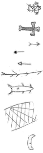 Artefactos: incluye la cruz cristiana (solo presente en un sitio) y formas semejantes a la flecha, el arpón, la red y la panga o embarcación. No se cuentan aquí aquellos artefactos que aparecen en una escena (tema 10) sino los que se representan solos. No es un tipo de motivo muy extendido.