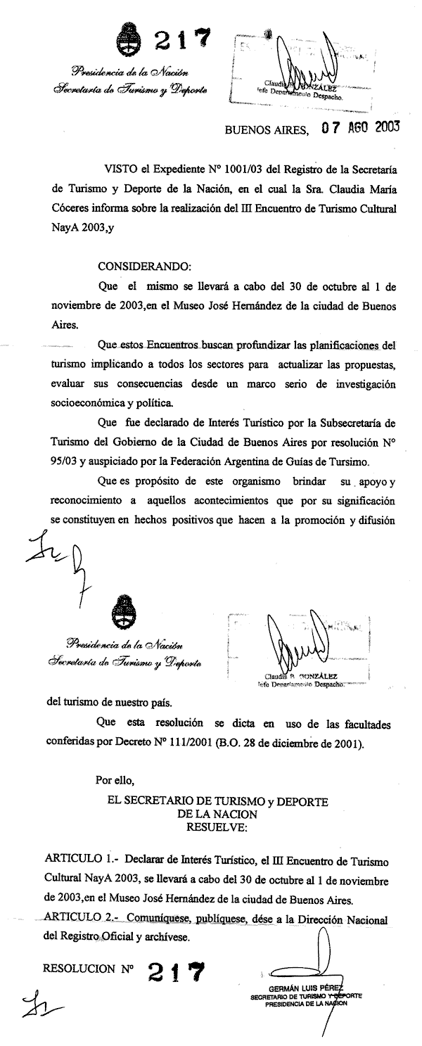 En representación de la Sociedad Argentina de Antrología tengo el sumo agrado de exresar la adhesión que está Sociedad realiza en relación con la celebración del III Encuentro de Turismo Cultural NayA que se llevará a cabo en Buenos Aires los días 30 y 31 de octubre y 1ro de noviembre del corriente. Los fundamentos de este Encuentro coinciden plenamente con el espíritu de la SAA.
